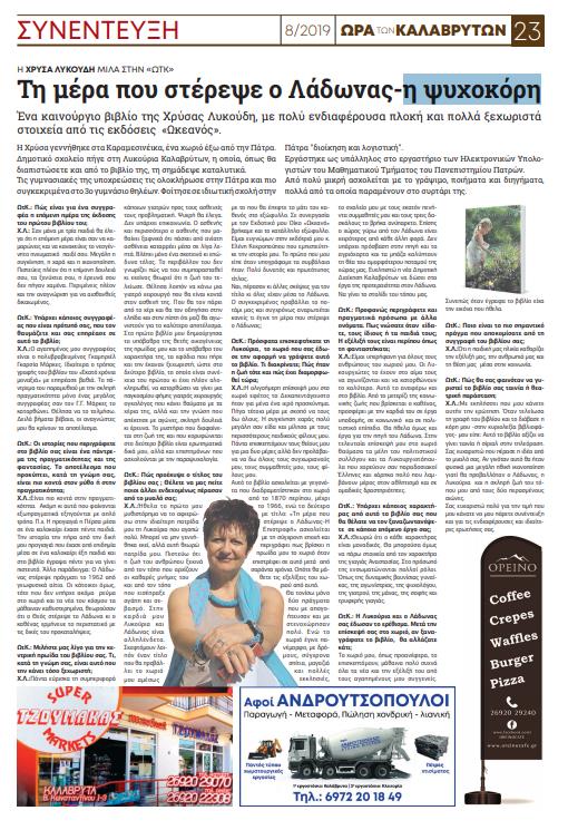 Η συγγραφέας έδωσε μια ενδιαφέρουσα συνέντευξη στην εφημερίδα «Ωρα των Καλαβρύτων» την οποία και αναδημοσιέυουμε: