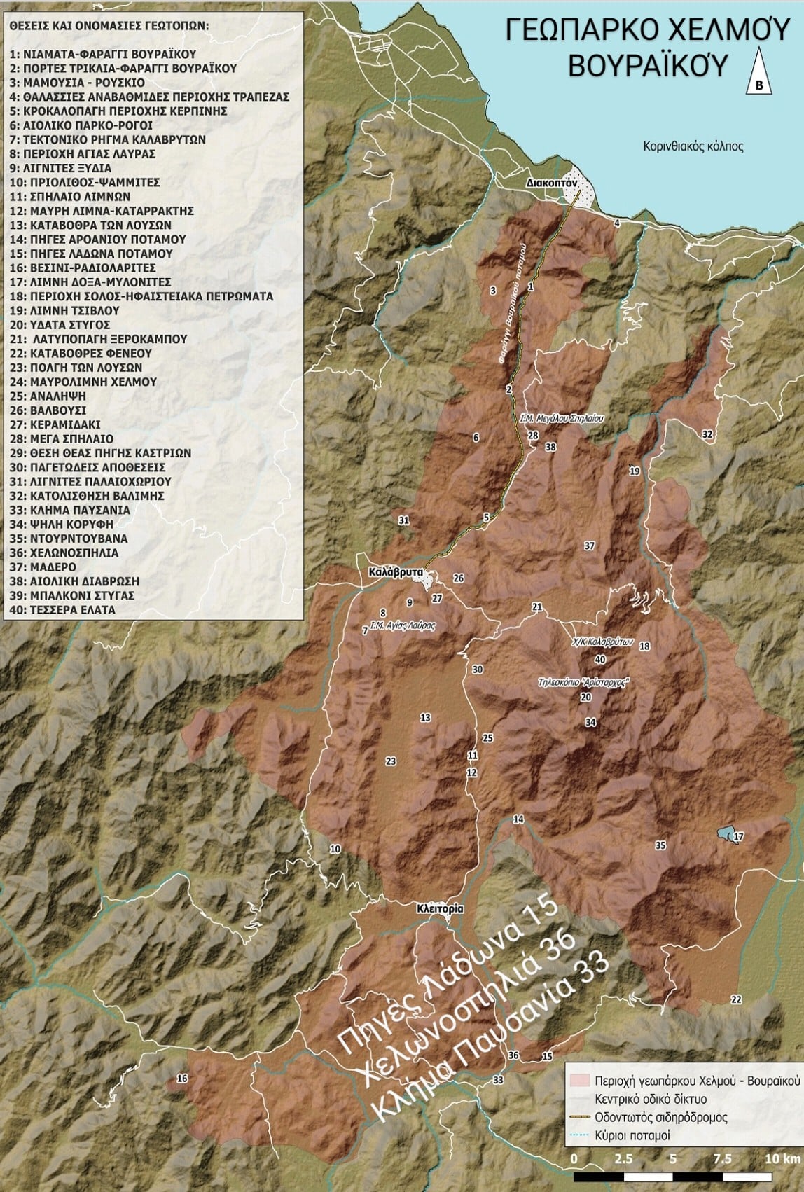 Χάρτης του Γεωπάρκου Χελμού-Βουραϊκού περιλαμβάνει εκτός των άλλων, τις ΠΗΓΕΣ ΛΑΔΩΝΑ, τη ΧΕΛΩΝΟΣΠΗΛΙΑ και το ΚΛΗΜΑ ΠΑΥΣΑΝΙΑ